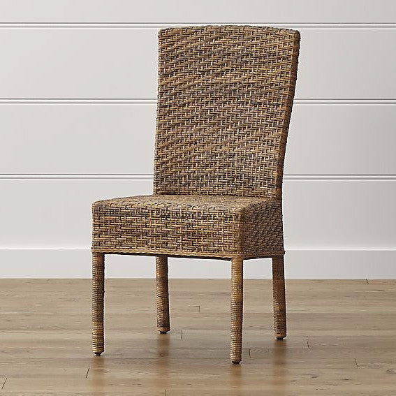 The particular species of rattan used in the Tigris Side Chair has mottled honey tones that resemble a tiger's coat. Handwoven natural rattan peel is woven over a solid mahogany frame in a tropical rendition of the Parsons style chair.