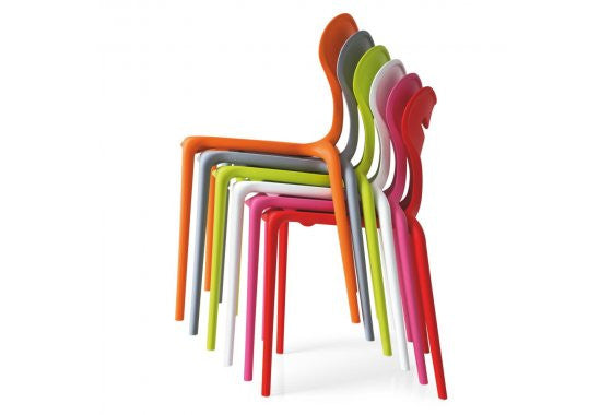 Stackable chair, suitable for outdoor use, with an attractive backrest design.
